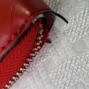 Vera Bradley red faux leather accordion wallet, preowned, has some scuffing and wear, see pictures. Has 12 card slots and inside zipper pocket. Still has plenty of life left in it.