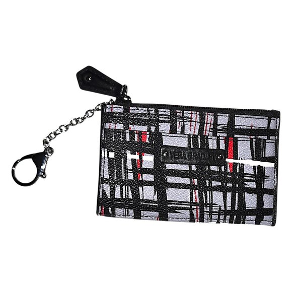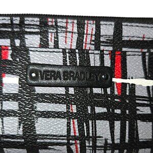 This Vera Bradley coin purse features the retired Art Plaid pattern in durable faux leather, offering a modern mix of grey, black, and red tones.