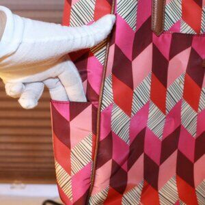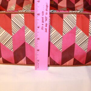 Geometric in pink, orange, brown and black/white with burgundy interior