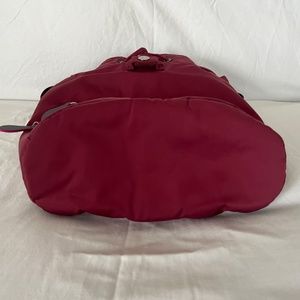 Measures 12" long, 12" wide, 5" deep, has drawstring/magnetic flap closure, three exterior front zip pockets, one interior zip pocket, two interior slip pockets, adjustable backpack straps, and a grey hanging loop in the back.
