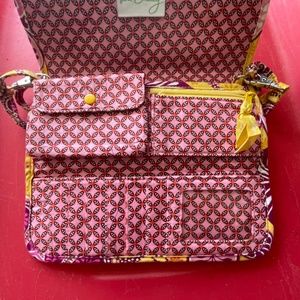 Retired pattern. Brand new. Never used. This wallet measures approx. 9" x 4" with a 54" removable crossbody/shoulder strap. This spacious wallet has a double magnet closure, an I.D. window, slip in pocket for checkbook, 6 card pockets, a bill pocket, zippered coin, and a snap pocket. It can double as a crossbody and/or wallet and is great to carry with all your important daily information.