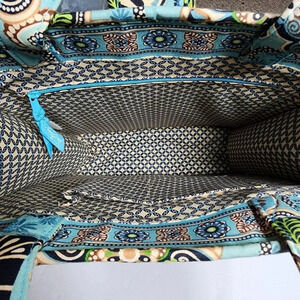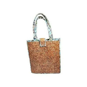 This Vera Bradley Bali Tiki BAG TOTE Purse is a must-have for any fashion-forward woman. The square shape and multicolor handle/strap add a unique touch to this classic style. The interior is lined with cotton and features inner and outer pockets, bottom studs, and a double handle for easy carrying. The exterior is made of bamboo and features a beautiful floral pattern, quilted accents, and brown hardware. This tote purse is perfect for any occasion, whether it's for travel, a party, work, or just a casual day out.