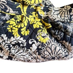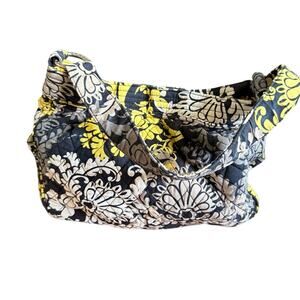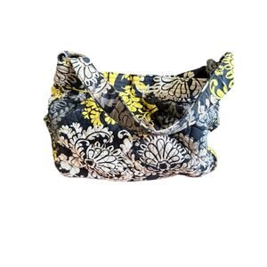 Vera Bradley small shoulder bag or diaper bag in a beautiful yellow and black baroque floral print. This bag features a multitude of pockets both inside and out, a small convenient size, a single shoulder strap and the classic Vera Bradley padded style. This bag is in excellent preowned condition with no rips, holes or stains. Please see images for details and approximate measurements.