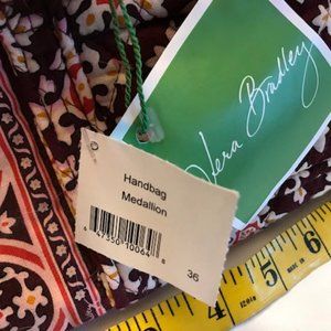 Vera Bradley Brown medallion Barrel Duffel Style Shoulder Bag Zipper Top Purse. Retired pattern from Fall 2006. Fall colors: brown with creams, and oranges. Never used, tags still attached but something red ran on it in places so it looks partly cream and partly pinkish but totally works with the colors.