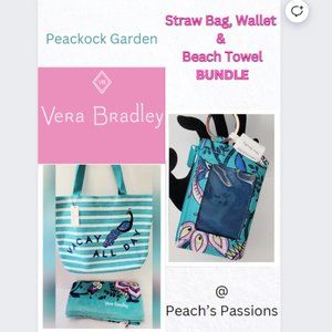 Vera Bradley Beach Towel, Straw Tote & Wallet BUNDLE in Peacock Garden …