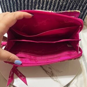 The turn lock wallet has a zipper with lots of room for cards inside and a zipper pocket on the back.Open up with more slip pocket for cards. Check out all picture.