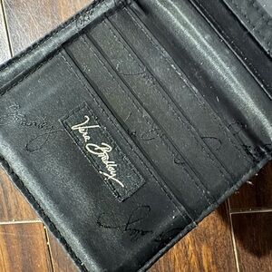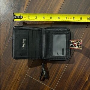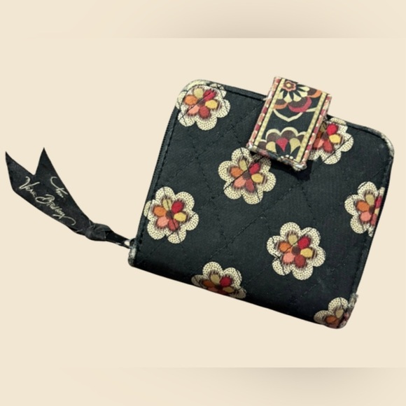 Chic Vera Bradley quilted wallet in a black floral pattern with red, tan, and cream accents. Features a snap closure, multiple card slots, clear ID window, and a zip coin section. Compact and functional — perfect for everyday use or travel!