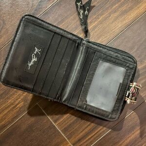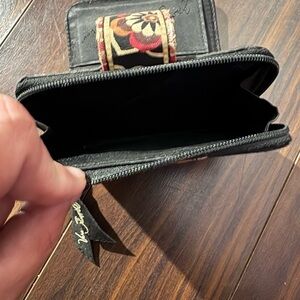 Good preowned condition. Shows minor interior wear (light lint and fabric fray on card slots) and slight edge wear on the exterior — see photos for details. Still very functional with working zipper and snap.