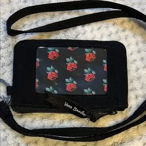 Vera Bradley Black Lanyard ID Wallet with Red Rose Print