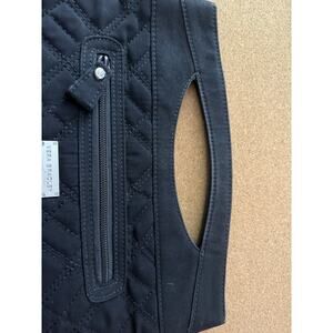 This Vera Bradley clutch is made of black microfiber with a zebra print theme. It features a magnetic top handle closure and silver hardware. The medium-sized clutch has a quilted exterior and is lightweight. The interior is lined with a zebra print fabric design and includes inner pockets and a front pocket. The clutch is in good pre-owned condition with wear shown in the handle area (pic 2) and scratches on the name plate (pic 3) ; the interior is slightly dirty.