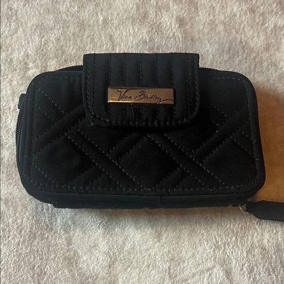 Snap-front black quilted wallet with the Vera Bradley silver logo imprinted on front, 2 separate inner compartments with plenty of room for cash, credit cards, etc . geometric print on the inside, the Vera Bradley logo on the outside