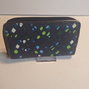 Vera bradley ink spots women's wallet, the wallet has 12 card slots, Window I.D, and zipper compartment.Chic wallet featuring vibrant blue and green accents. Secure zip closure. the wallet is in good condition with a mark.