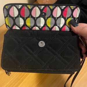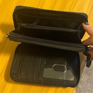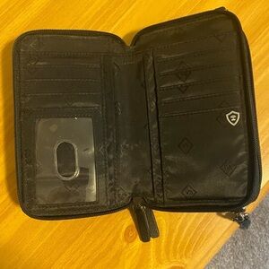 Interior features 10 card slips, 4 slip pockets, 1 bill pocket, 1 interior back compartment pocket, 1 ID window