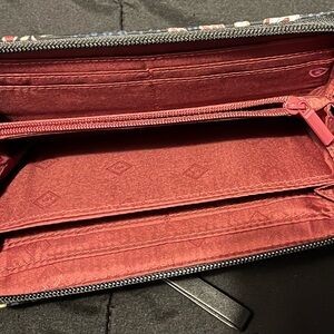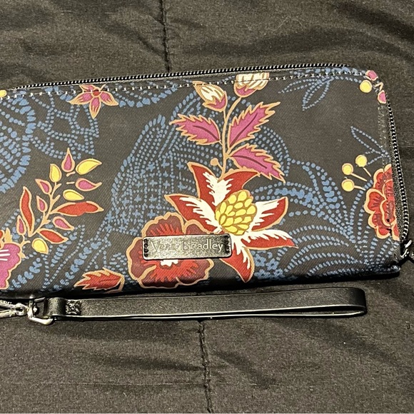 Elegant wristlet with bold floral pattern. Features secure zip closure and wrist strap.