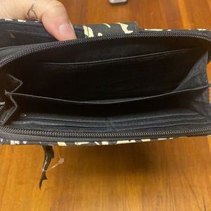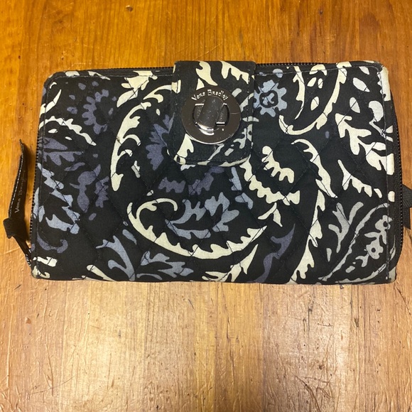 Stylish Vera Bradley wallet. Features a black and white floral pattern. Secure clasp closure. Measures 8” x 5”