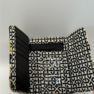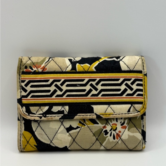 Stylish wallet with floral design. Features black, yellow, and cream colors. Ideal for daily use.