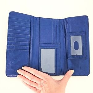 Blue, green, and ivory stripe quilted fabric with blue vegan faux leather trim. Interior cards slots, large pocket for bills, and clear ID holder. Back zipper coin pocket. Magnetic closure. Original tags still attached.