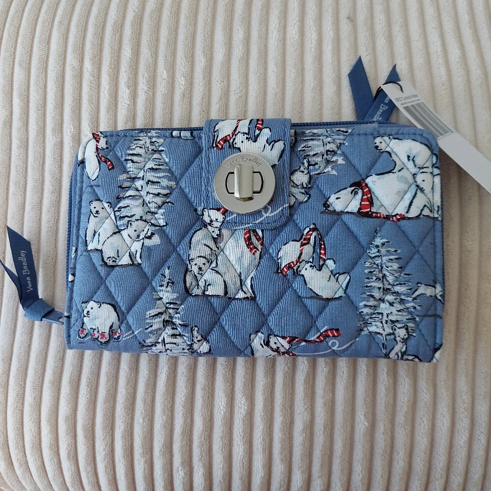 Adorable quilted wallet with polar bear design. Secure clasp closure. Ideal for everyday use.Vera Bradley Turnlock & Zip Wallet in the "Beary Merry" pattern holiday christma