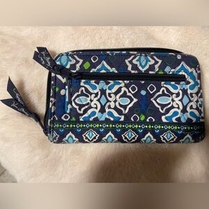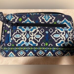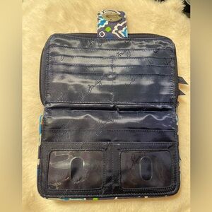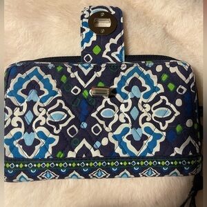 Stylish Vera Bradley wallet. Features blue and green geometric pattern. Secure clasp closure.