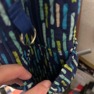 Vibrant pattern with blue, green, and cream. Ideal for daily use. Stylish and practical design. See all pics for colors. Has zipper pockets and two pockets, one on each side.