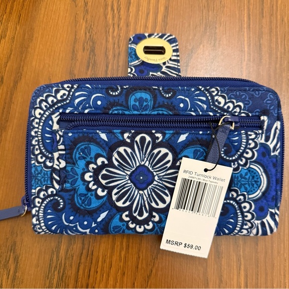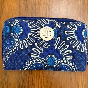 Stylish Vera Bradley wallet. Features blue and white floral pattern. Secure turnlock closure. Compact and functional design.