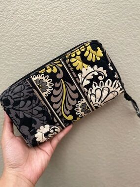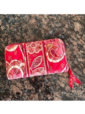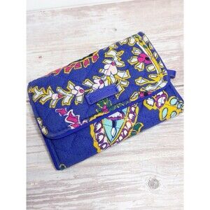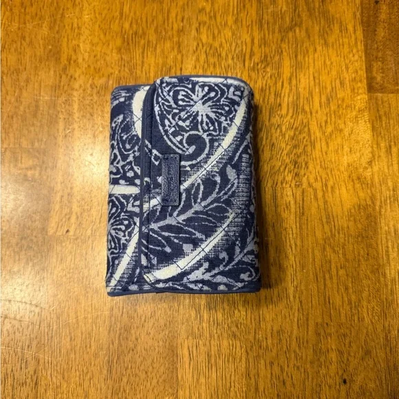 Stylish Vera Bradley wallet. Features intricate blue and white pattern. Compact and elegant design.