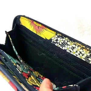 A multicolored design accentuates the look of the Vera Bradley Cotton Wrap around Zip Wallet! It comes with ample space to keep all your essentials in one place. Recycled cotton construction. Zippered closure. Multiple Interior pockets, & one interior larger zippered pocket. Lining: Floral cotton.