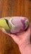 Pretty sunglasses or glasses case by Vera Bradley. Hard clamshell. Top is rounded to easily fit larger glasses. Violet with green, tan, brown, and black pattern. (Retired pattern, unsure of name.) Very good condition. I believe this larger style is no longer available. Discovered it cleaning out my car, as I have kept my sunglasses in a compartment by my rear view mirror for a few years now.