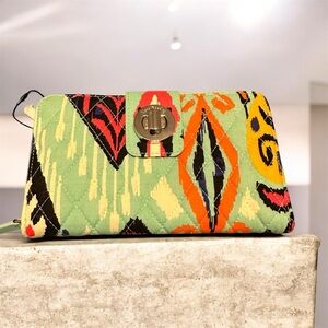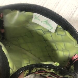 A charming Vera Bradley coin purse, perfect for keeping your essentials organized with a touch of floral elegance. This small zip pouch features a vibrant floral pattern on a black background, accented by a decorative band with pink and green geometric designs. The interior is lined in a coordinating green fabric, adding a pop of color and ensuring your items are protected. Ideal for carrying coins, cards, or small accessories, this Vera Bradley coin purse is a stylish and practical addition to your everyday carry. Perfect for travel, shopping, or simply keeping your handbag tidy.
