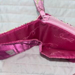 Vibrant paisley wallet with pink and green patterns. Features a zip closure and decorative strap. some fading and discoloration and imperfections. Please see photos.
