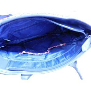 detachable cross body strap with double handles, exterior mini front pocket, zipper top closure, flat footed bottom- fully lined inside with interior zipper and side organizer pockets- measures 14X10"