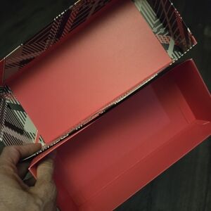 Chic box with a plaid pattern. Features bold red, coral pink, gray and black accents.