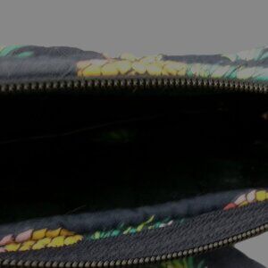Vera Bradley Cosmetic Makeup Bag and ID Holder Keyring in Toucan Party Fabric Bundle. The bag measures 7 3/4 by 4 1/4 inches. The inside is lined with plastic. The ID Case features a zipper closure, an ID slot, and an attached split key ring. It measures approximately 5 by 3 inches. The bag is a little brighter than the ID holder, which you can see in the 3rd photo, which shows the back. In the 4th photo at the bottom, near the seam, you can see a tiny white spot on the bag. These are in good shape overall, and the fabric is so fun. Be sure to view all photos.