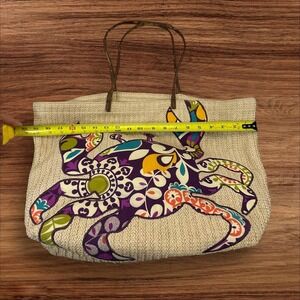Tropical getaway awaits with this charming Vera Bradley set. A delightful straw tote features a whimsical, oversized crab design in vibrant purples, greens, and oranges, instantly transporting you to sun-drenched shores. Paired with it is a clear cosmetic pouch with a matching crab motif, perfect for keeping your essentials organized and visible on the go. The tote has a woven texture and comfortable handles, ensuring a relaxed yet stylish beachside or poolside experience. The clear cosmetic pouch has a zip closure to keep your smaller essentials contained.