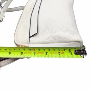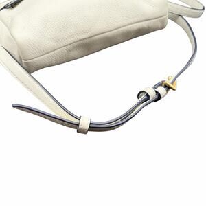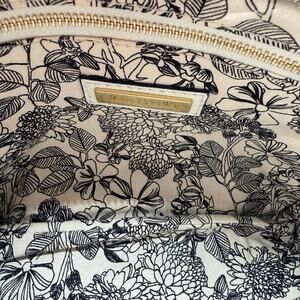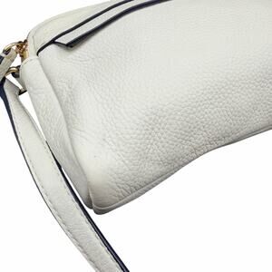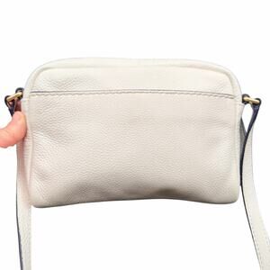 Vera Bradley small crossbody bag in a soft cream/ivory pebbled leather with gold-tone hardware. Features a top zip closure, exterior slip pocket, and adjustable crossbody strap. Interior is fully lined in Vera Bradley’s signature black & white floral print with interior slip pocket and logo plaque. Compact but functional—perfect for everyday essentials, travel, or errands. Neutral color pairs easily with casual or elevated outfits. Preowned and in very good condition with light normal wear; no major flaws noted. See photos for measurements and details.