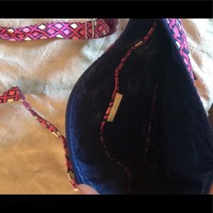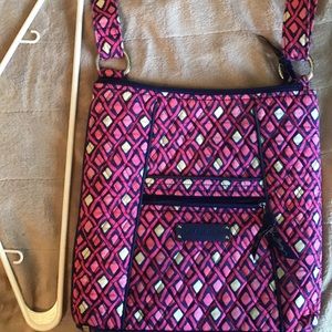 Super cute pink and purple patterned bag from Vera Bradley. The top zips shut and there is a zipper pouch on the front as well. Adjustable strap, plenty of room for all your daily necessities.