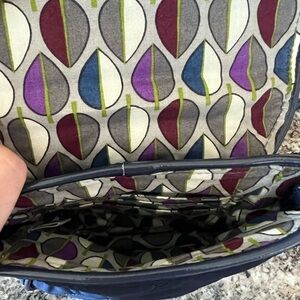 Navy blue with silver tone hardware. Exterior pocket and snap closure. 3 card slots interior. Excellent condition!