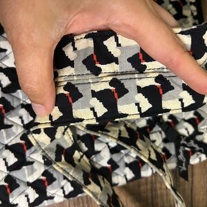 Adorable Vera Bradley quilted crossbody bag featuring a fun dog print pattern in black, gray, cream, and pops of red.