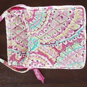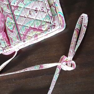 This is a Vera Bradley crossbody bag/ purse. The distinct color of this bag is pink with pastel greens, yellows, blues and pinks. This is a used in great condition bag. It has been knotted on the strap to fit the previous owner. I am nodded it refer to photos.