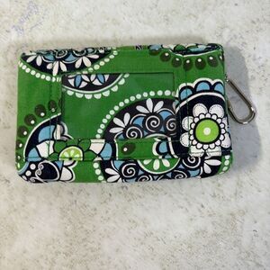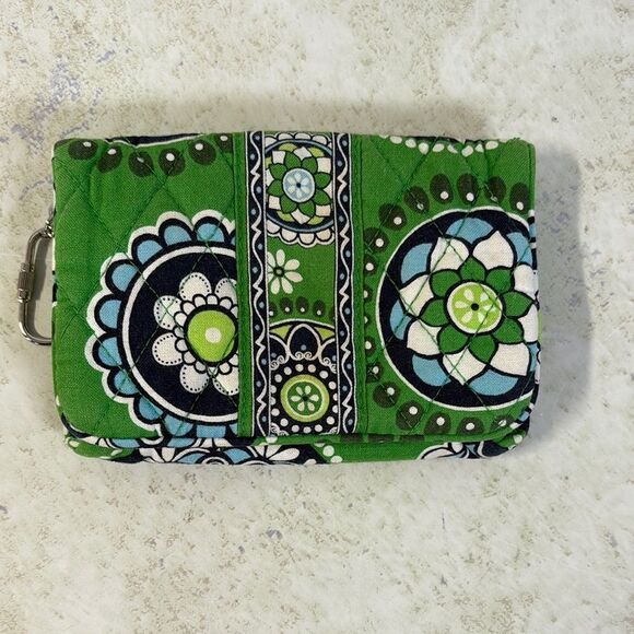 Stylish green quilted wallet with floral patterns. Features a secure clasp.