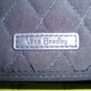 This nice for everyday use very compact Vera Bradley dark blue clutch/ wristlet or crossbody wallet with detachable straps for both bracelet and shoulder/crossbody straps.
