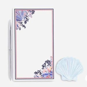 Vera Bradley Morning Shells desk notes with pen. Stock photos provided to better show detail. Brand new, still in original packaging. Adorable seashell pattern! Comes with paper tray, 100 sheet notepad, 100 sheet seashell sticky notepad, silver twist pen with black ink. I have a few other items in this pattern listed separately!