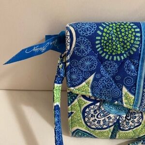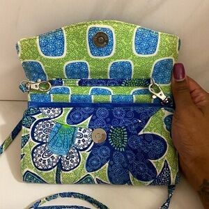 Doodle Daisy pattern; blue and green floral print; long detachable strap; pleated design; two zip pockets; magnetic snap closure; lined interior w/ three slip pockets; 12 card pockets; ID window