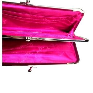 The Vera Bradley Double KISSLOCK WALLET in Very Berry Paisley is a stylish and functional clutch bag featuring a double kisslock closure. The pink paisley pattern on a quilted cotton exterior, along with multicolor handles and silver hardware, adds a touch of elegance. This bag is perfect for various occasions such as travel, weddings, parties, casual outings, and business events. The nylon lining in pink complements the exterior and keeps your essentials organized securely.