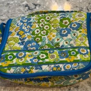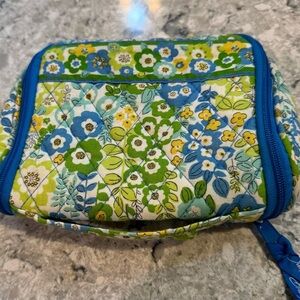 Vera Bradley floral travel organizer with blue trim. Features multiple compartments and clear pockets.