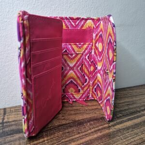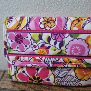 Authentic Vera Bradley Euro Tri-Fold Wallet in a vibrant floral pattern with pink, yellow, and purple tones. Retired pattern - clementine.