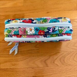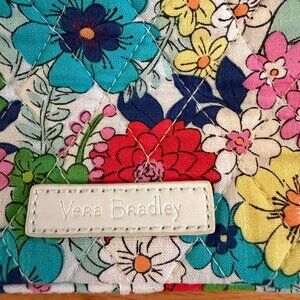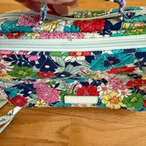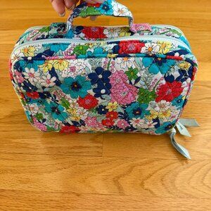 Vera Bradley Far Out Floral Compact Organizer Cosmetic Bag. Pretty floral fabric in hues of blue, red, pink, yellow and green. Top handle. Divided two sections with zipper closures. One section has one large open interior. The other section has brush/pencil holders on one side and on the other side has a zipper pocket. Both sections are lined in a light blue fabric. Excellent pre-owned condition. On the side with the zipper pocket there are a few darker spots near the top zipper closure. Several small stains, but overall it is in clean condition. No fabric information, but the exterior is classic Vera Bradley quilted cotton-like fabric.