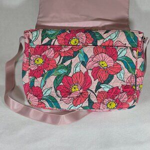 Bright, bold, and built for business! This Vera Bradley computer bag features a vibrant pink floral print with green leaves and yellow centers, plus a wide satiny pink crossbody strap for comfort and style.