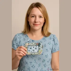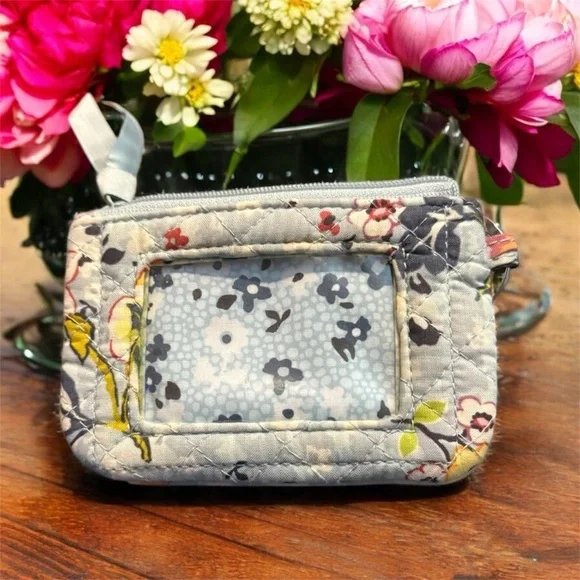 Vera Bradley card holder with a floral pattern in blue and cream. It features a clear ID window and a compact design.
