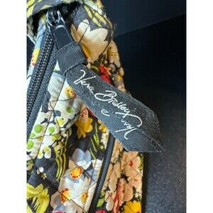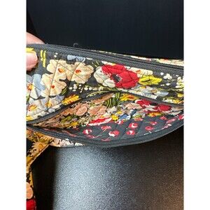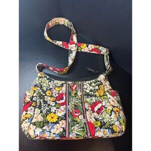 Classic Vera Bradley quilted crossbody bag in a retired floral print with red poppies and daisies on a black background. Lightweight and machine washable. Features two front zipper compartments, spacious interior, and adjustable strap.